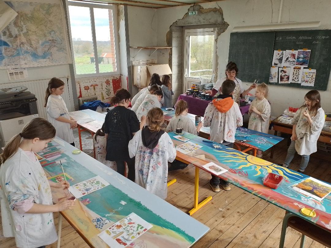 “Le premier matin, Guénola est arrivée avec tous ses matériaux et les planches en bois, Puis certains élèves de maternelle/CP ont peint le fond, d’autres ont peint les arbres, Les CE/CM , en groupes, ont peint : des monuments, des personnages, et des villes, Ensuite nous avons peint les détails.